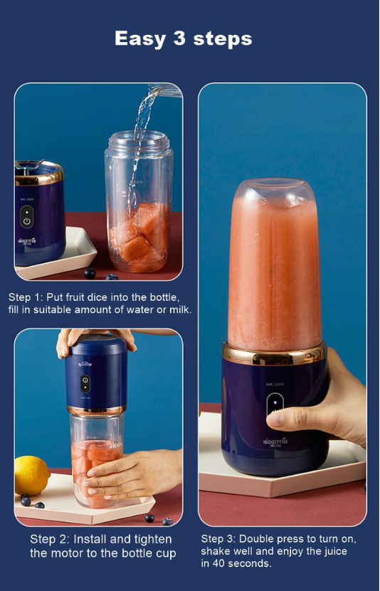 • Cốc xay trái cây có thể sạc lại. Được trang bị pin 1500mAh, bạn có thể sạc lại trên ô tô, máy tính và các thiết bị USB khác.