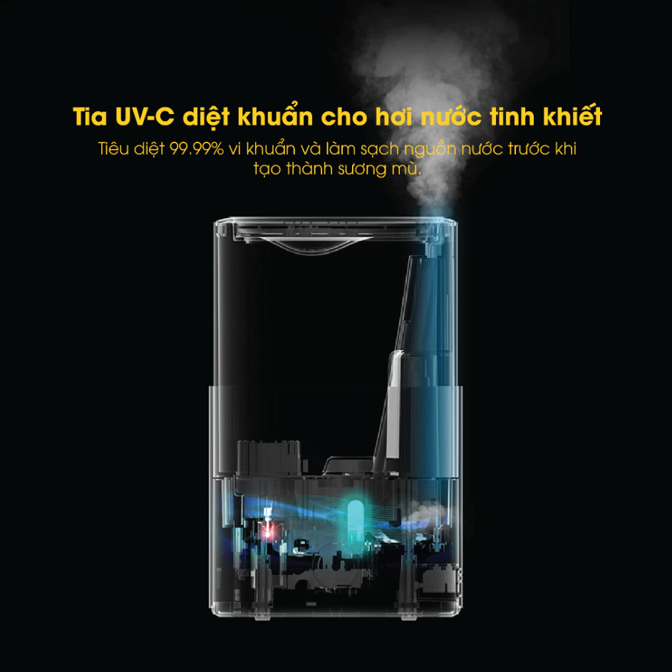✔️Mặc dù có thiết kế không nắp đậy nhưng điều đó không đồng nghĩa với việc nguồn nước tạo sương trên máy sẽ dễ dàng bị nhiễm khuẩn. Vì cơ chế bắn tia UV-C sẽ làm nhiệm vụ diệt khuẩn gần như tuyệt đối cho nguồn nước sử dụng trên thiết bị này. Để làm được điều đó máy đã được trang bị một đèn chiếu ánh sáng tử ngoại. Ánh sáng khi chiếu vào vi khuẩn sẽ phá hủy cấu trúc ADN và ức chế sự sinh sản của vi khuẩn trong nước. Giúp tiêu diệt 99.99% vi khuẩn và làm sạch nguồn nước trước khi tạo thành sương mù.
